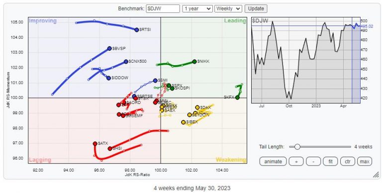 Above is the Relative Rotation Graph that shows the rotation for a group of international stock market indices against $DJW, The Dow Jones Global Index.