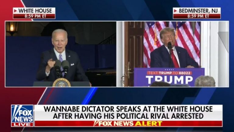 As President Biden spoke Tuesday night, the chyron at the bottom of the screen read, “WANNABE DICTATOR SPEAKS AT THE WHITE HOUSE AFTER HAVING HIS POLITICAL RIVAL ARRESTED.”